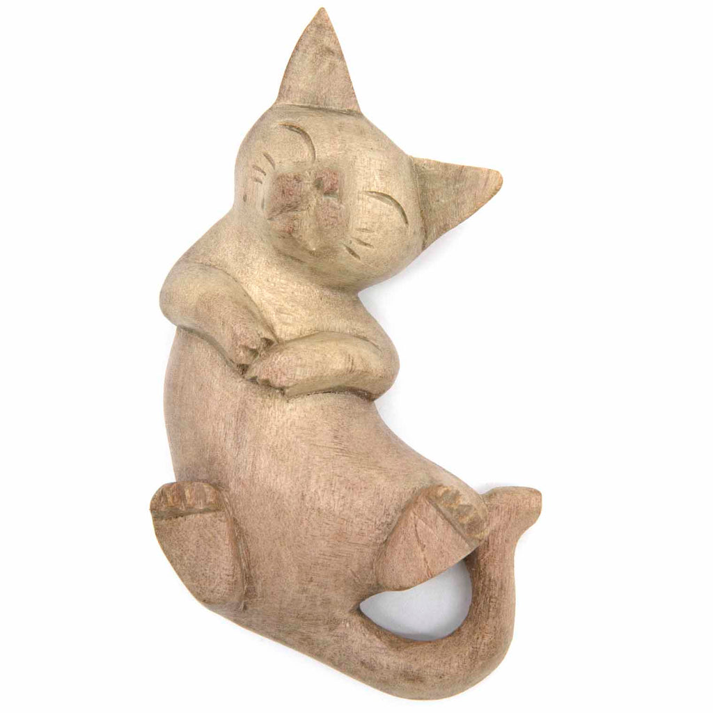 Woodcarving is a revered craft across Bali and Indonesia, where artisans carve local woods into creatures inspired by folklore and nature. The playing cat holds various symbolic meanings: independence and curiosity. Each figurine is shaped and sanded by hand, then stained or painted to enhance the grain and ensure a tactile feel.