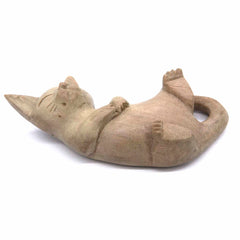 This Playing Cat Woodcarving is a hand-carved wooden figurine depicting a playing cat. Its detailed carving and smooth finish showcase the natural beauty of the wood, making it perfect for shelves, altars or desks.