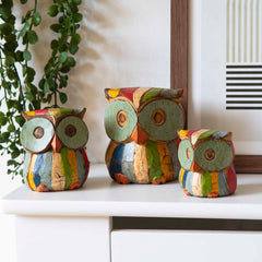 A charming set of three solid wood carvings of owls. Hand carved in Bali, each item is carefully hand painted and given a rustic style finish. Sizes are approximates. Large: 10cm × 10cm × 9cm. Medium: 8cm × 8cm × 7cm. Small: 7cm × 7cm × 6cm.