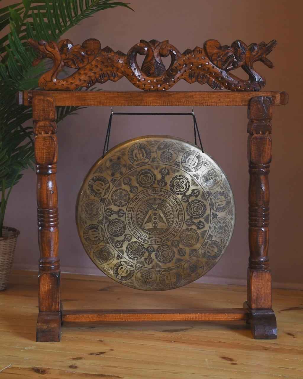 These hugely impressive extra large wind gong cymbals are individual hand hammered pieces and are produced in Kathmandu in Nepal. This extra large size has a particularly impressive dynamic range which makes it suitable for sound therapy as well as studio use. This beautiful gong has been hand etched with a stunning yogi and vajra design, featuring the seven chakras, the Om Mani Padme Hum mantra and traditional Tibetan patterns - a true work of art. Unique item. There is only one of these available.