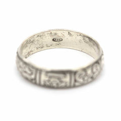 A single banded ring hand engraved with the Ashtamangala. These area sacred suite of Eight Auspicious Signs associated to a number of religions such as Hinduism, Jainism, and Buddhism. Each ring is 925 silver marked. Available in UK ring sizes N(14mm diameter) to X(27mm diameter)