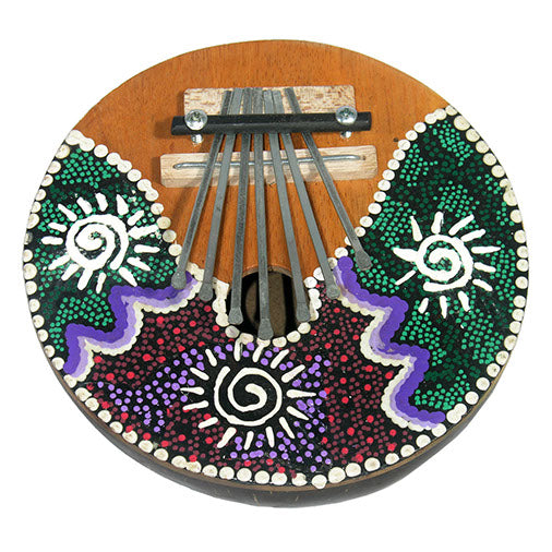 Delightful dot painted thumb piano with seven metal prongs also known as tines. The characteristic sound of this traditionally African instrument is produced by striking the tines with one's thumbs. This thumb piano is mounted on a polished coconut resonating chamber which allows for louder and more harmonically interesting tones. The pitch of the tines can be altered by loosening the screws and changing the length of the prongs, allowing the player to create their own scales. With its bright and colourful dot painting, this is a very attractive item that sounds great and is easy and fun to play.