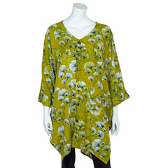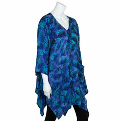 This knee length smock dress will keep you cool due to its lightweight rayon material and loose fit. It has three quarter length sleeves and a full button up front.