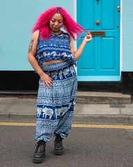 These wonderfully comfortable harem trousers have a drop crotch and an elasticated waist making them perfect for lounging or for stretching out on the yoga mat. Please note that the fabric used to make our elephant print range varies considerably between shipments and the product may not exactly match the image.