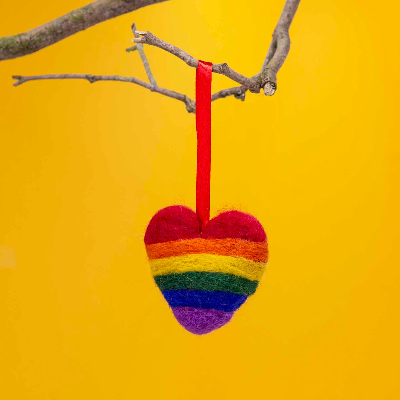 Show some rainbow love with this cheerful Pride Heart Felt Hanging! Handmade from soft wool felt in Nepal, each heart is stitched in vibrant rainbow stripes and finished with a red hanging loop, ready to brighten any corner of your home. Perfect as a year-round decoration, it also makes a joyful alternative addition to your Christmas tree.