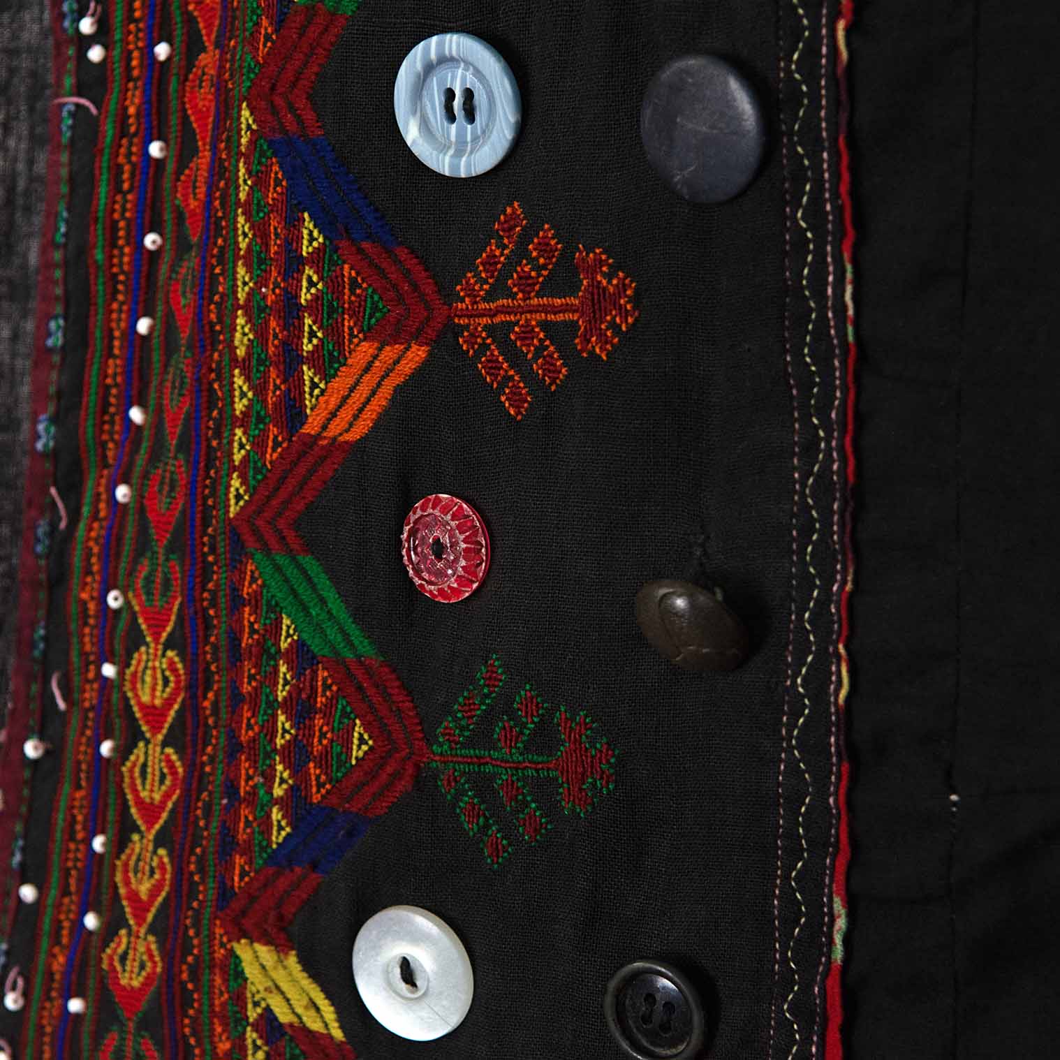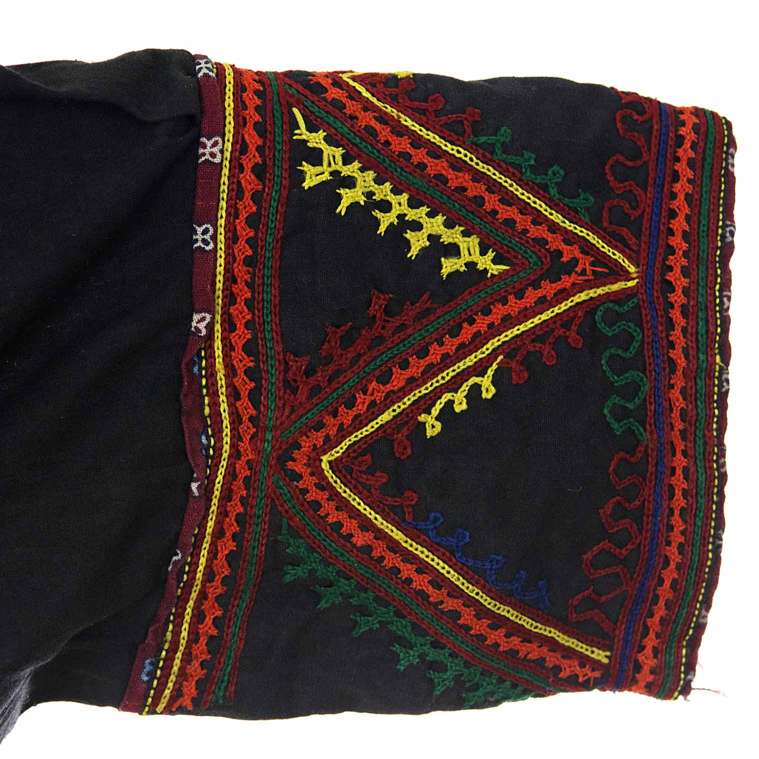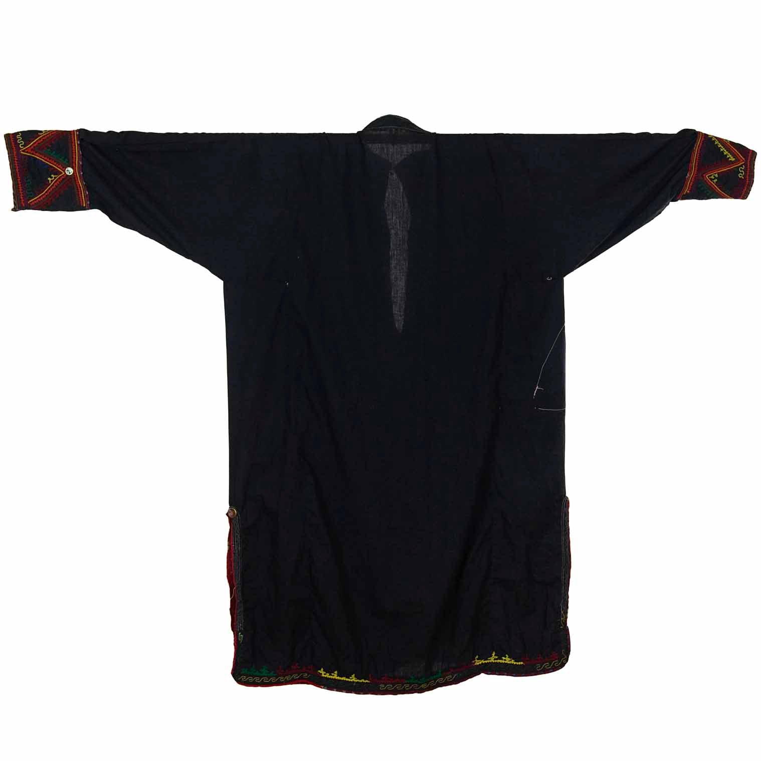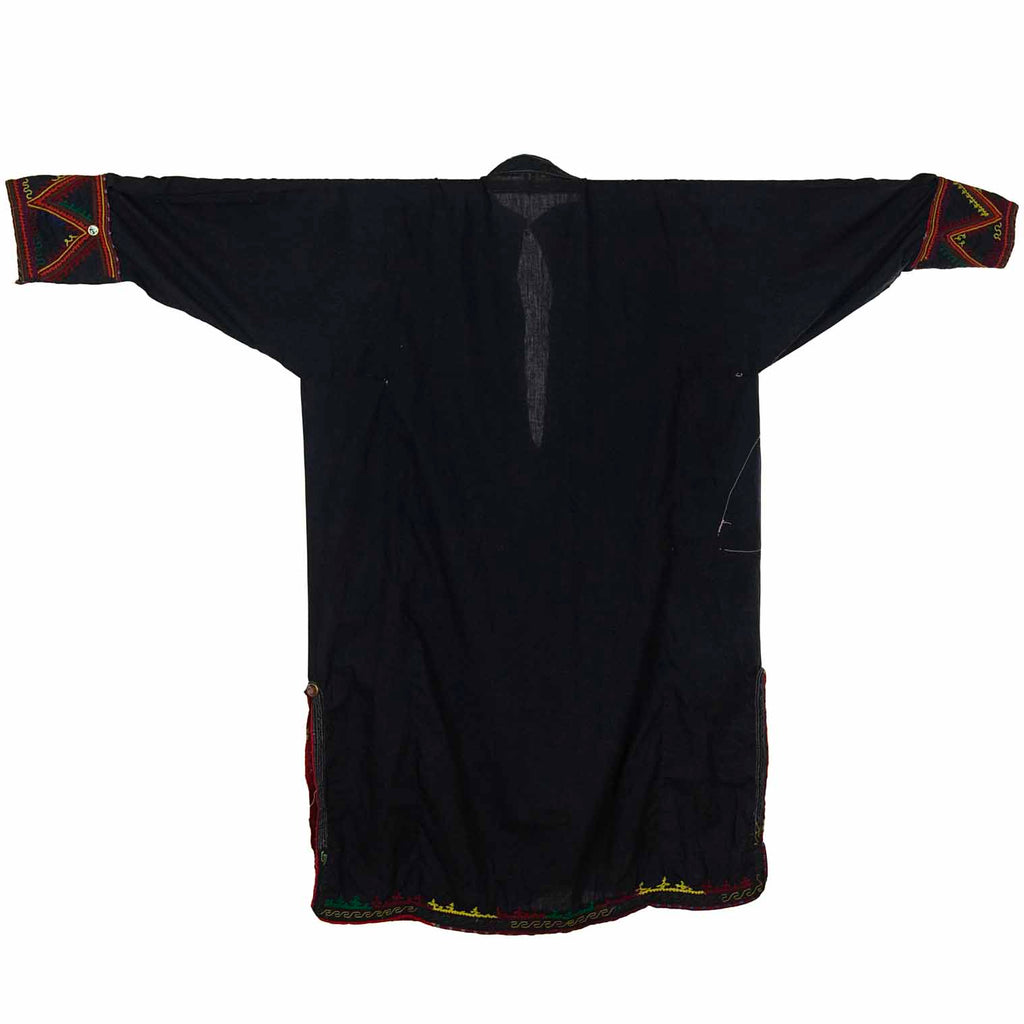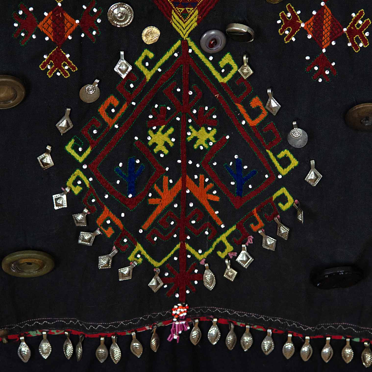 This stunning example of a tribal Afghan Kuchi dress has been dated to the 1980's and has been embellished with coins from this era. The hand embroidery is a beautiful and traditional art form that showcases the skills of Afghan artists, and each colour holds special significance within the culture; black represents strength and resilience.