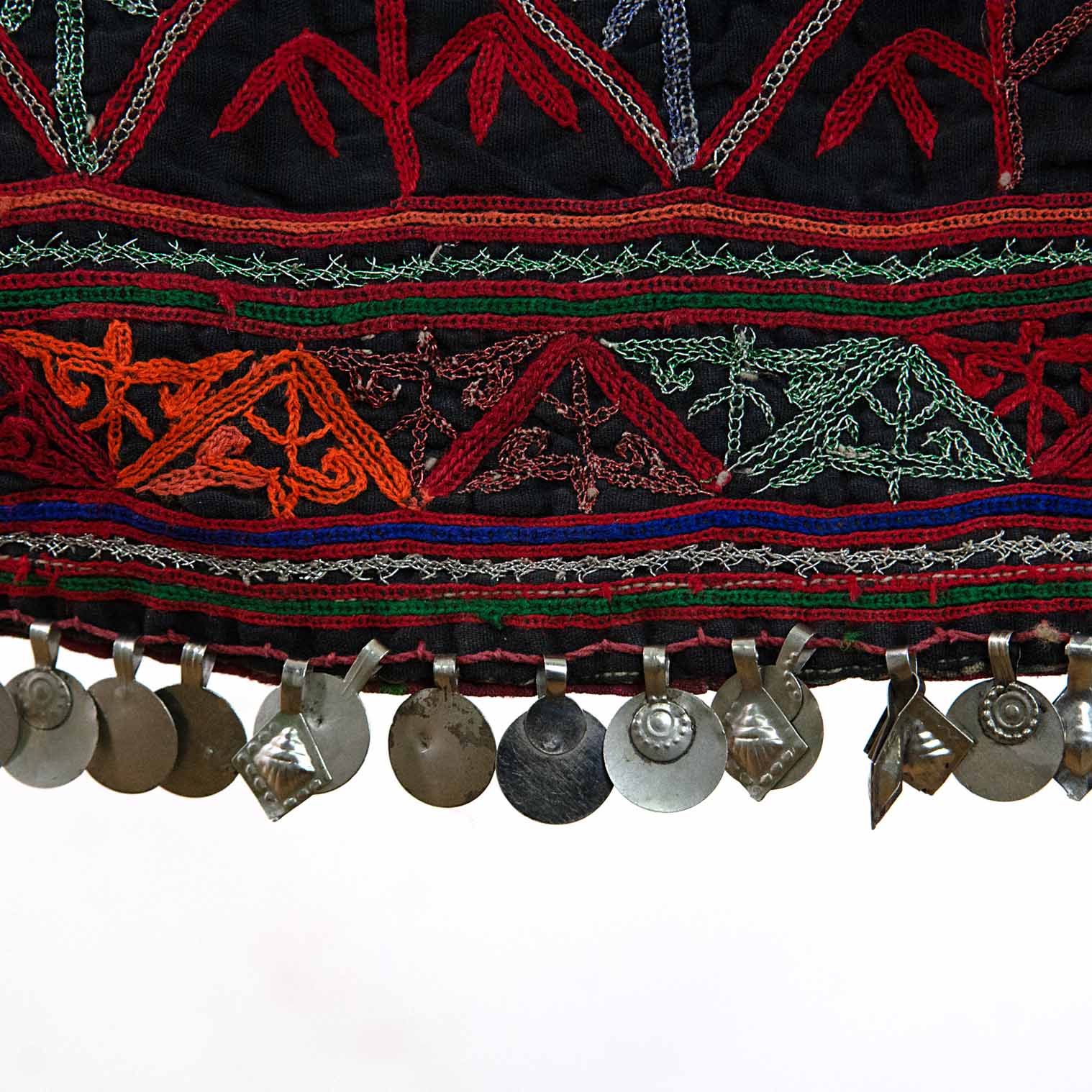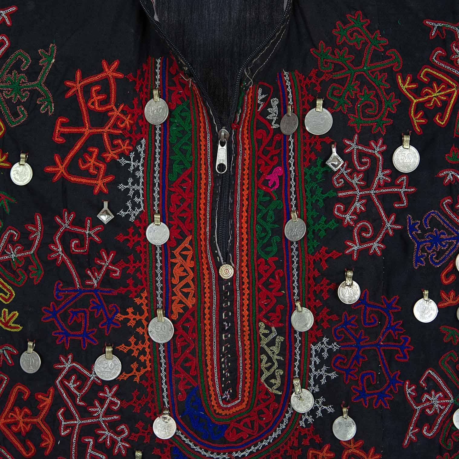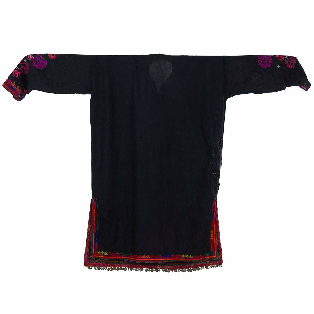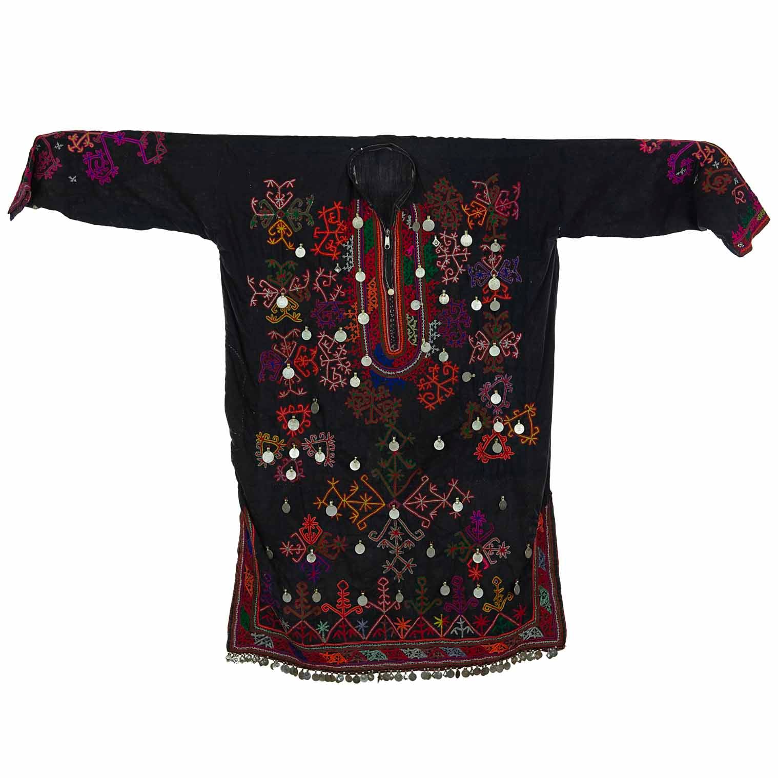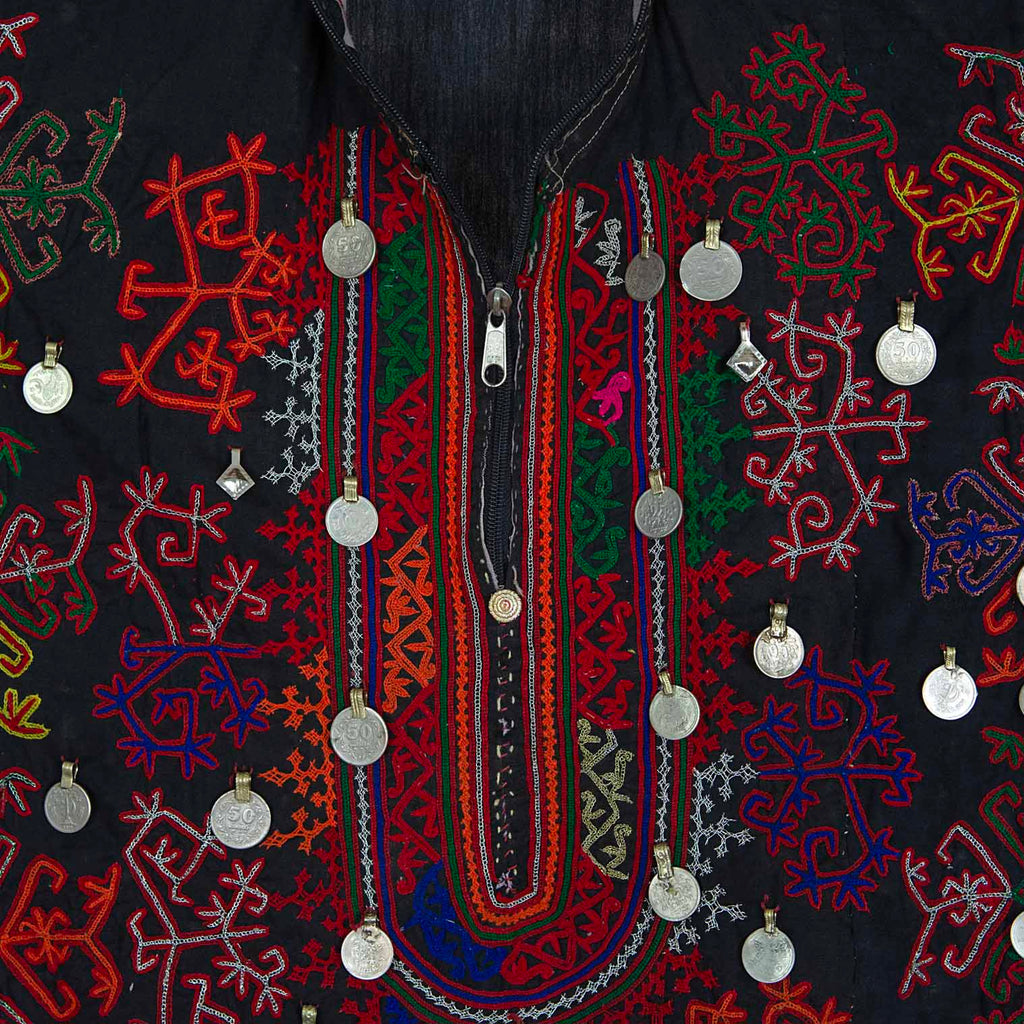 This stunning example of a tribal Afghan Kuchi dress has been dated to the 1980's and has been embellished with coins from this era. The hand embroidery is a beautiful and traditional art form that showcases the skills of Afghan artists, and each colour holds special significance within the culture; black represents strength and resilience.