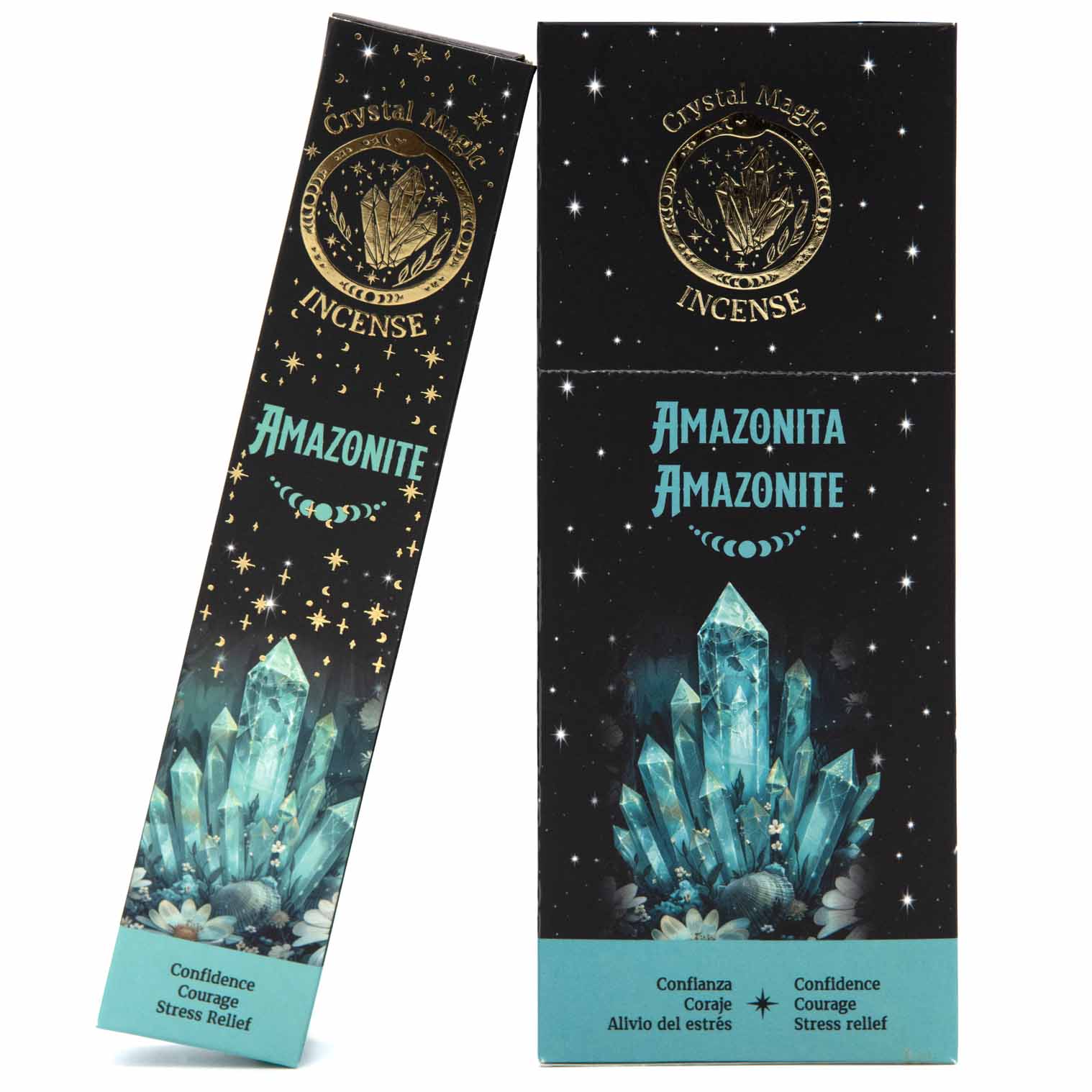 This Amazonite incense from the Crystal Magic range by Hari Darshan includes an information card about the crystal and a small set of mini amazonite crystals. Amazonite is believed to soothe anxiety and stress, promote clear communication and truth, and balance masculine and feminine energies while encouraging courage and self-discovery.