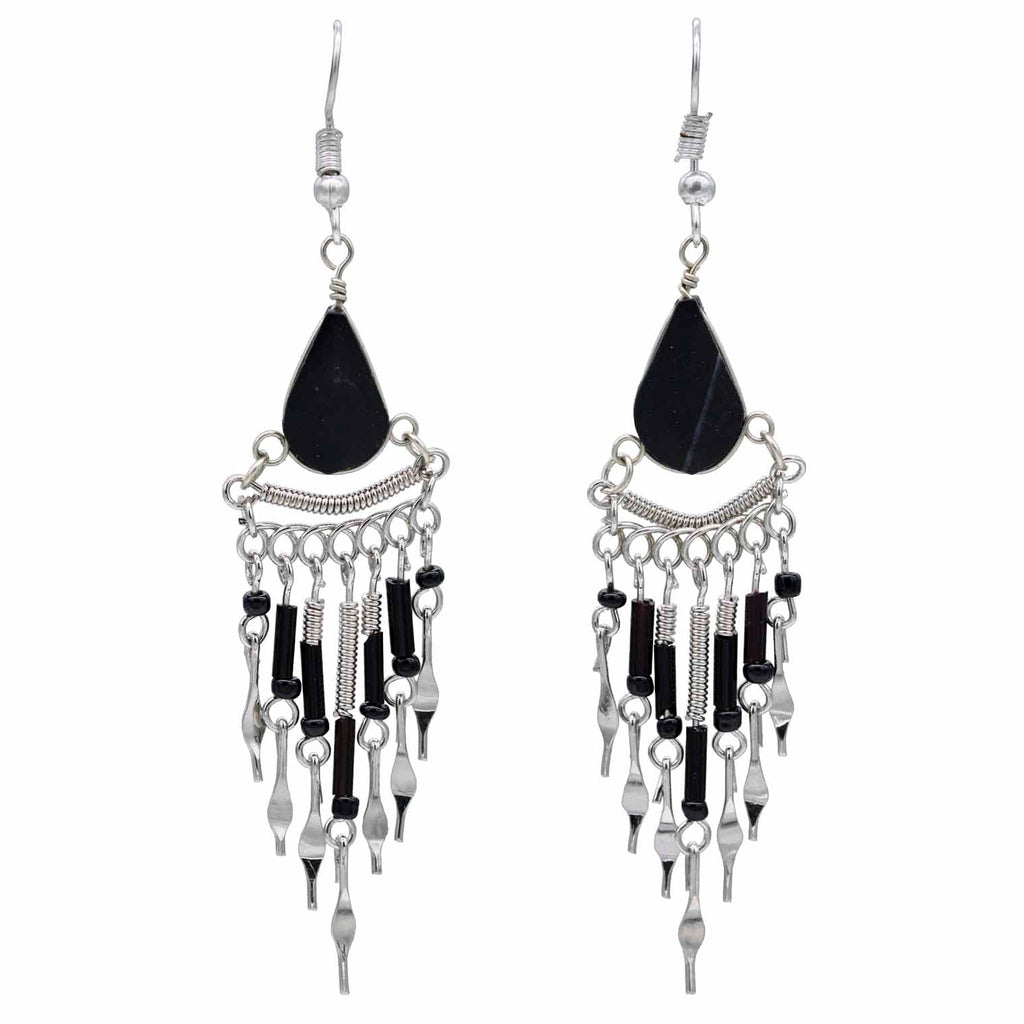 These earrings are handmade in Peru with colourful stone teardrops and matching glass beads. Silver plated hooks.