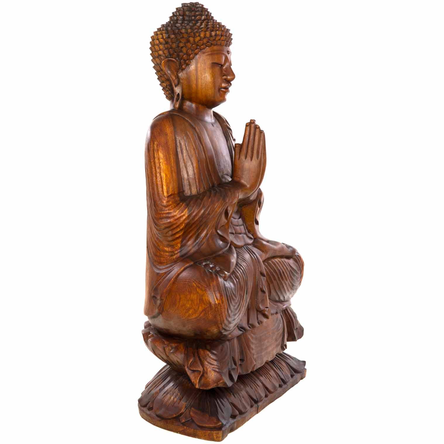 This 80cm seated Buddha has been carefully and expertly hand carved on the island of Bali. Each of these incredible works of art is created from a solid piece of suar wood. When depicting Buddha, the positioning of the hands (Mudra) is very important and different mudra represent different things. Here, Buddha is shown with his hands in the Anjali mudra ('prayer hands') and this represents respect, greeting, reverence and devotion. The position (Asana) for seated Buddhas is often this full lotus position with the feet resting on the thigh of the other leg and the soles facing upwards. This meditative asana is known as Dhyana Asana or Padmasana. As this item is both large and heavy, collection from our warehouse is preferred. We may be able to send direct, please contact us for shipping prices and information if you are interested