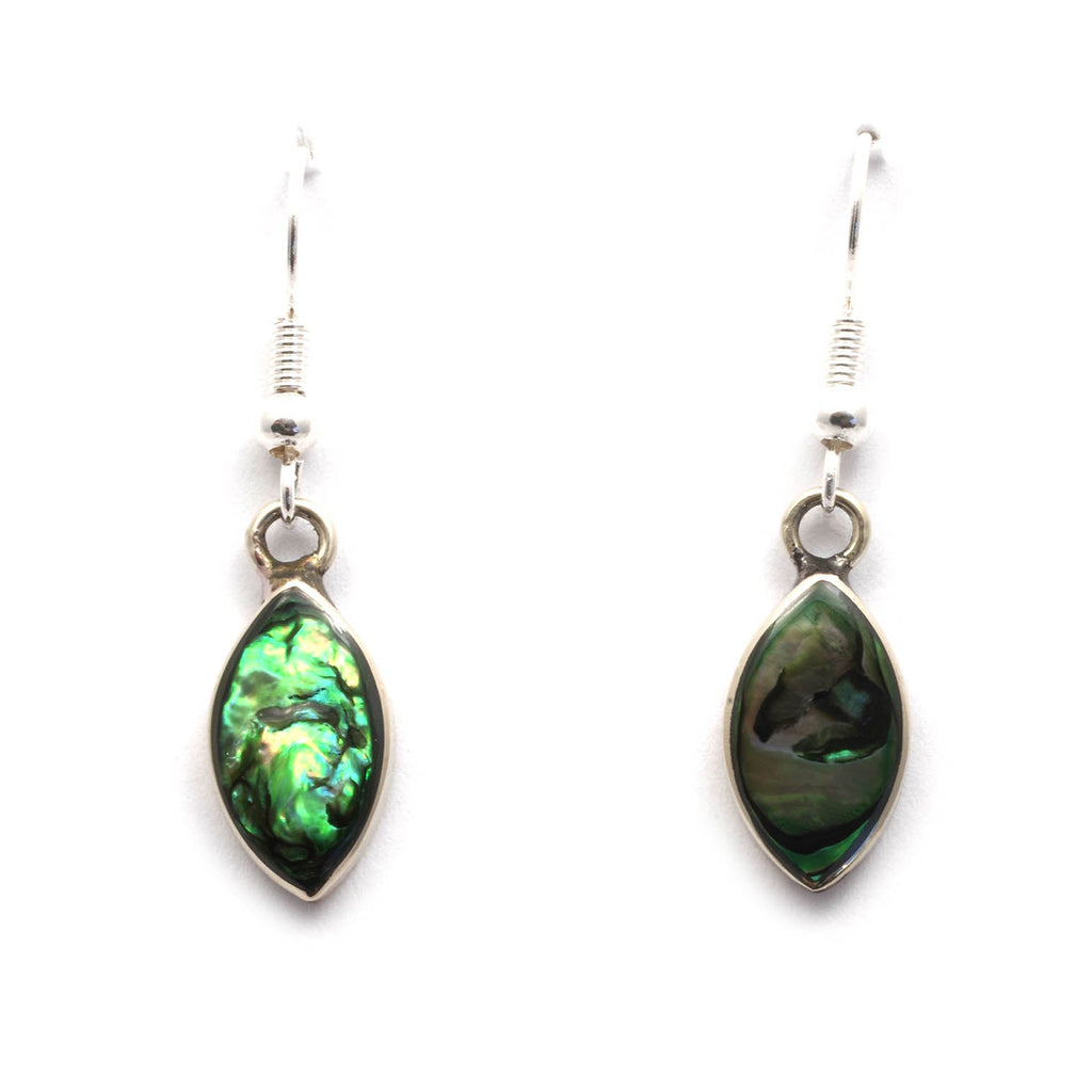 These oval shaped earrings are handcrafted in Taxco, Mexico. Craftsmen use a traditional Alpaca metal alloy to create the frame, then fill with deep, shimmering colours derived from dyed pearly abalone shell. Silver plated fixings with Alpaca metal alloy earrings