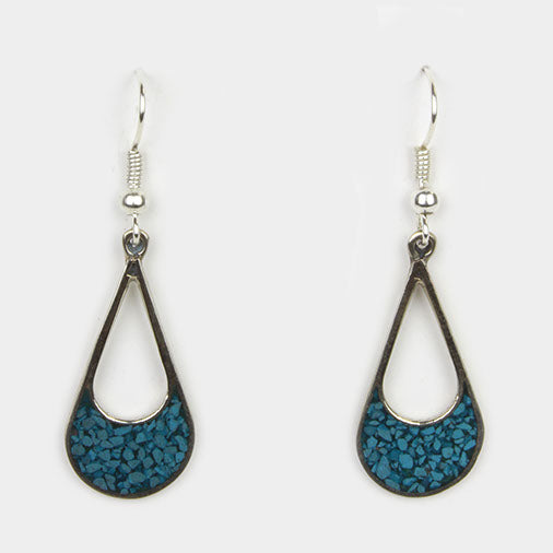 These large cutaway tear drop earrings are handmade in the town of Taxco, Mexico. They are made from Alpaca silver metal alloy and are available in a great mix of colours. Silver plated hooks.