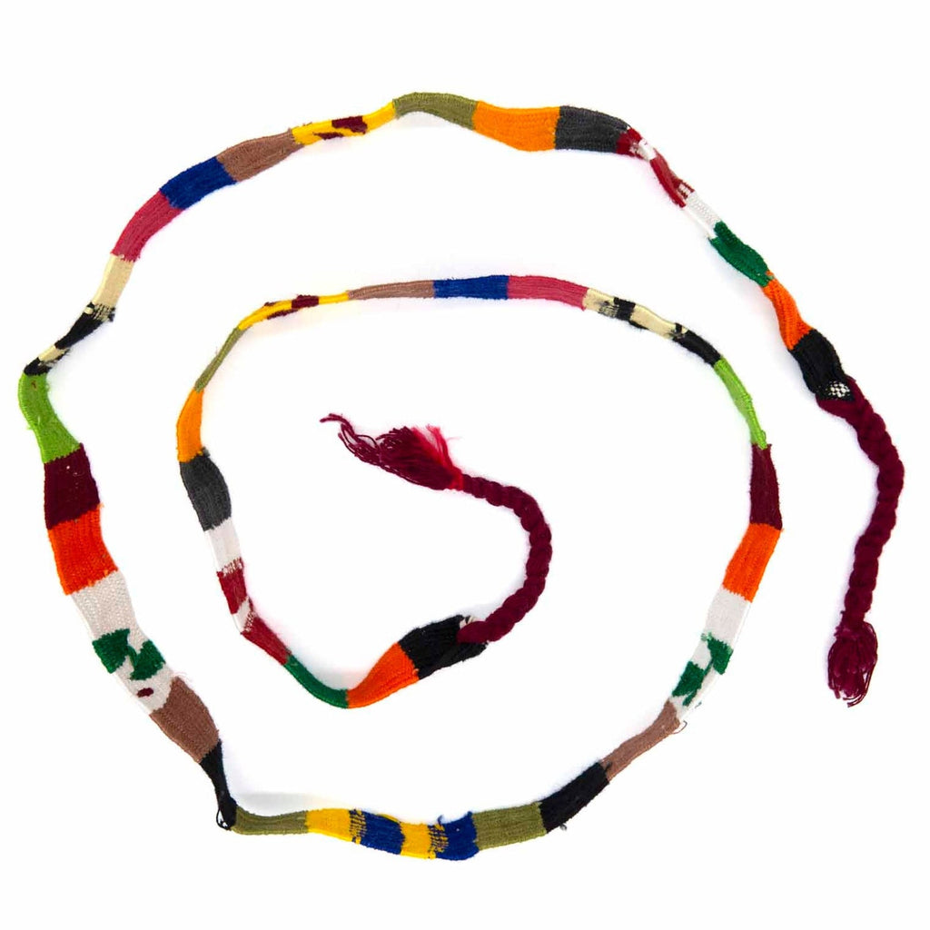 Long hand woven fabric straps in various colours and patterns, each with braided tassels ends.A traditional Mayan craft, these fabric straps are made entirely by hand on a special narrow hand loom from brightly coloured cotton. They are predominantly used as belts (Faja) by wrapping around the waist and tying a simple knot however they are also used as a hair ornaments (Cintas). As the belts are all individually made each one is slightly different, varying at the whim of the weaver. However many of the designs are also often specific to different villages in highland Guatemala, and the different patterns would originally have allowed Guatemalans to identify where people were from.These fantastic cotton craft pieces show the vibrant nature of Guatemalan culture and the incredible traditional skills for which they are famous. The straps are very strong but we would recommend hand washing in cold water to preserve the colours.