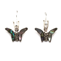 A pair of eye-catching butterfly design earrings, hand crafted by artisans in Taxco, Mexico using a traditional metal alloy known as Alpaca silver. These rather intricate set of earrings have their wings finished with iridescent abalone shell. Silver plated fixings with Alpaca metal alloy earrings Size and Shape vary