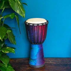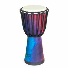 A wonderful sounding 40cm djembe produced in Bali. The varnished rainbow sarong covering of this bright and resplendent drum make it perfect for young and old alike.