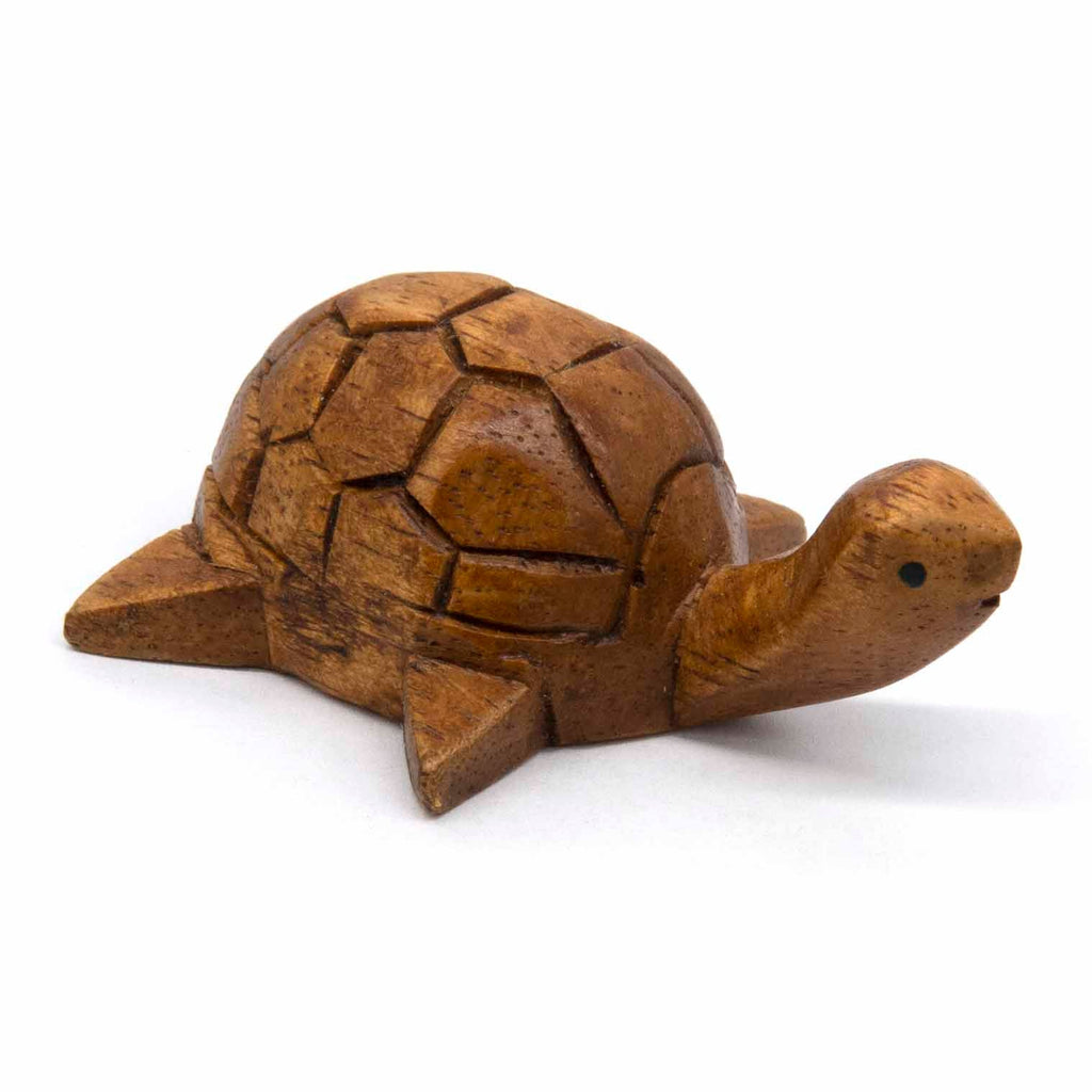 This terrific little turtle has been hand carved from jempinis wood and makes a great mini ornament for the sideboard or a cheerful little desk buddy.