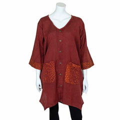 These knee length smock dresses will keep you cool due to their lightweight cotton material and loose fit. They have pretty printed pockets and full button up front. The three quarter length sleeves also have an attractive mix pattern trim.