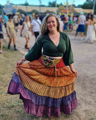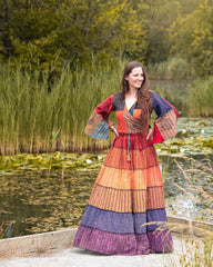 This skirt is handmade in Nepal from breathable cotton, keeping you cool and comfortable while you twirl, dance or wander. Each tier showcases a blend of rich, earthy tones and vibrant brights—perfect for lovers of boho fashion, rainbow outfits and statement style. The elasticated waist with drawstring tie makes it an easy fit for most body types.