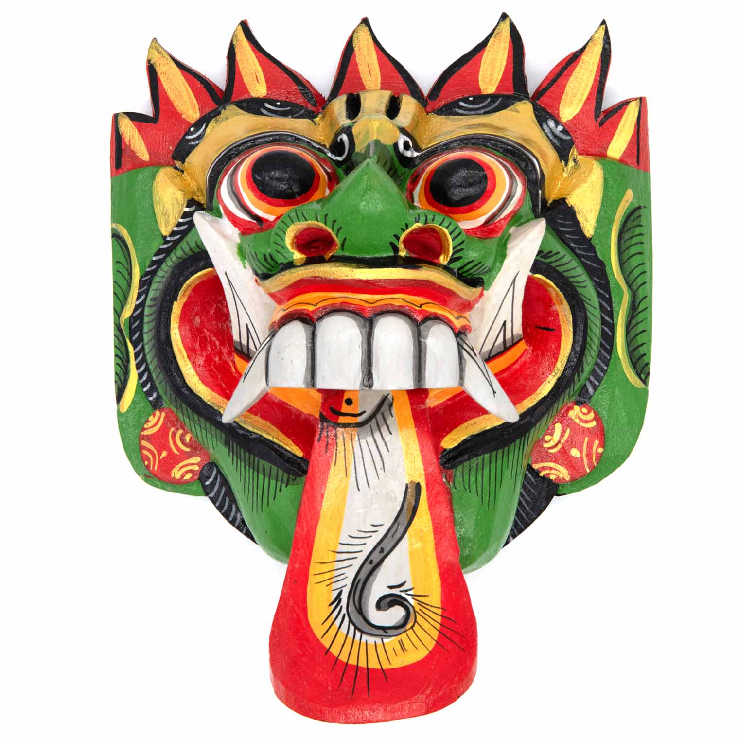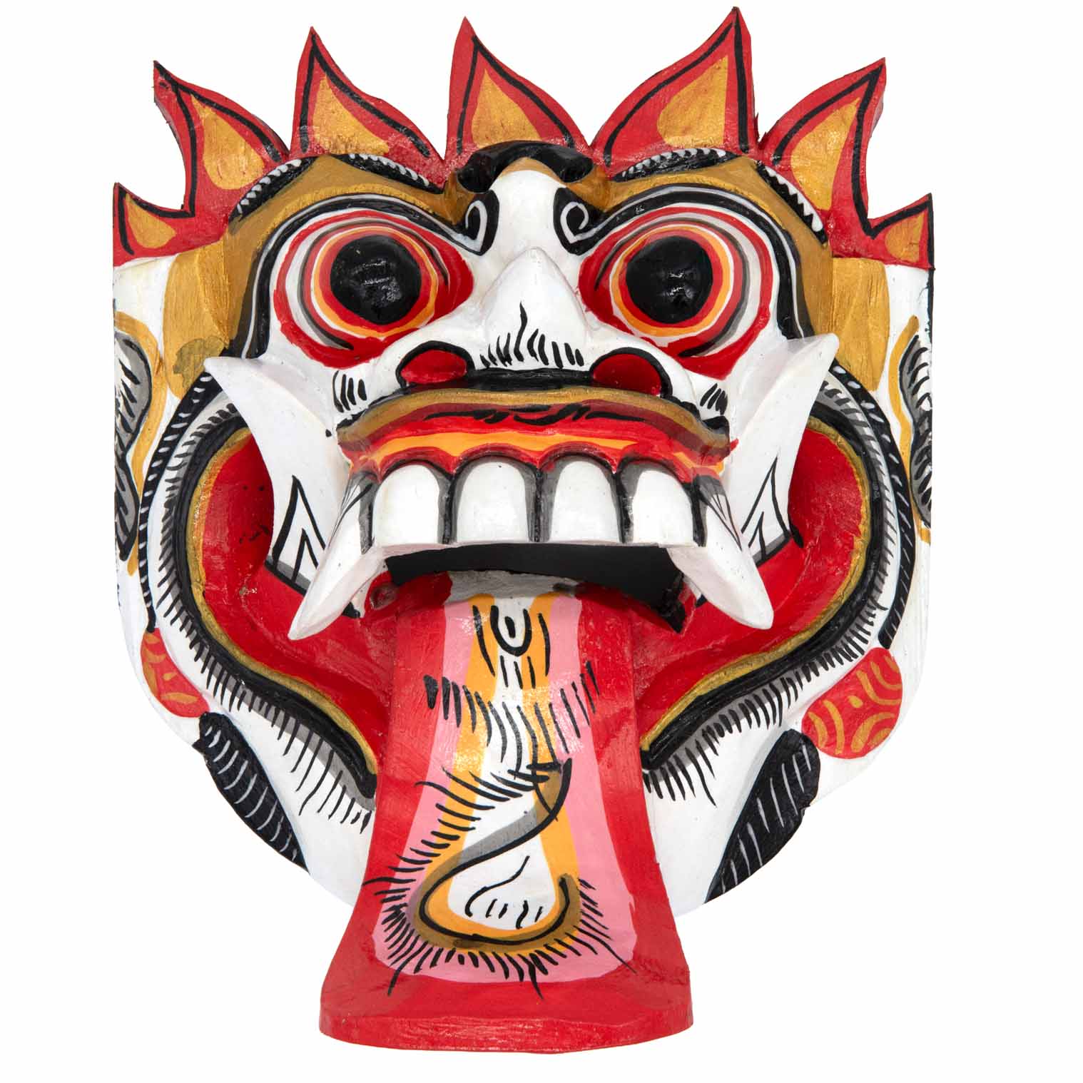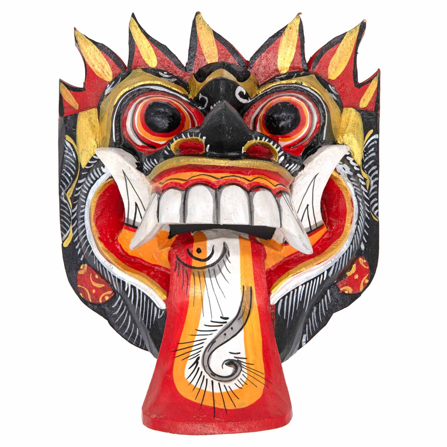 The Rangda mask is a traditional Balinese mask seen in the Barong dance. The mask depicts Rangda who is the queen of witches and represents the personification of all evil. She is depicted with a grotesque visage with protruding fangs, wild goggle eyes and long tongue. In the dance, she leads a terrifying army of witches against the forces of good and their leader, Barong.