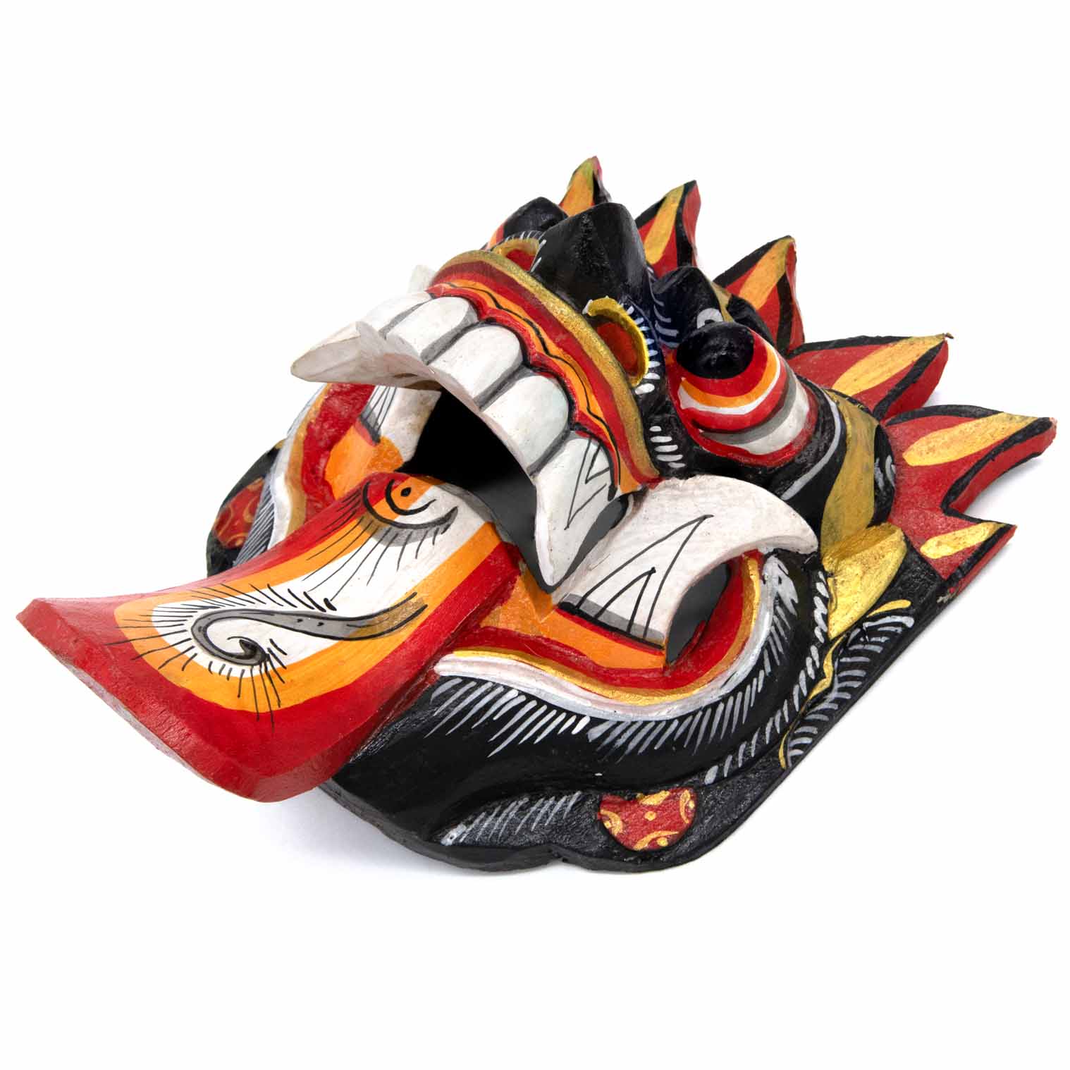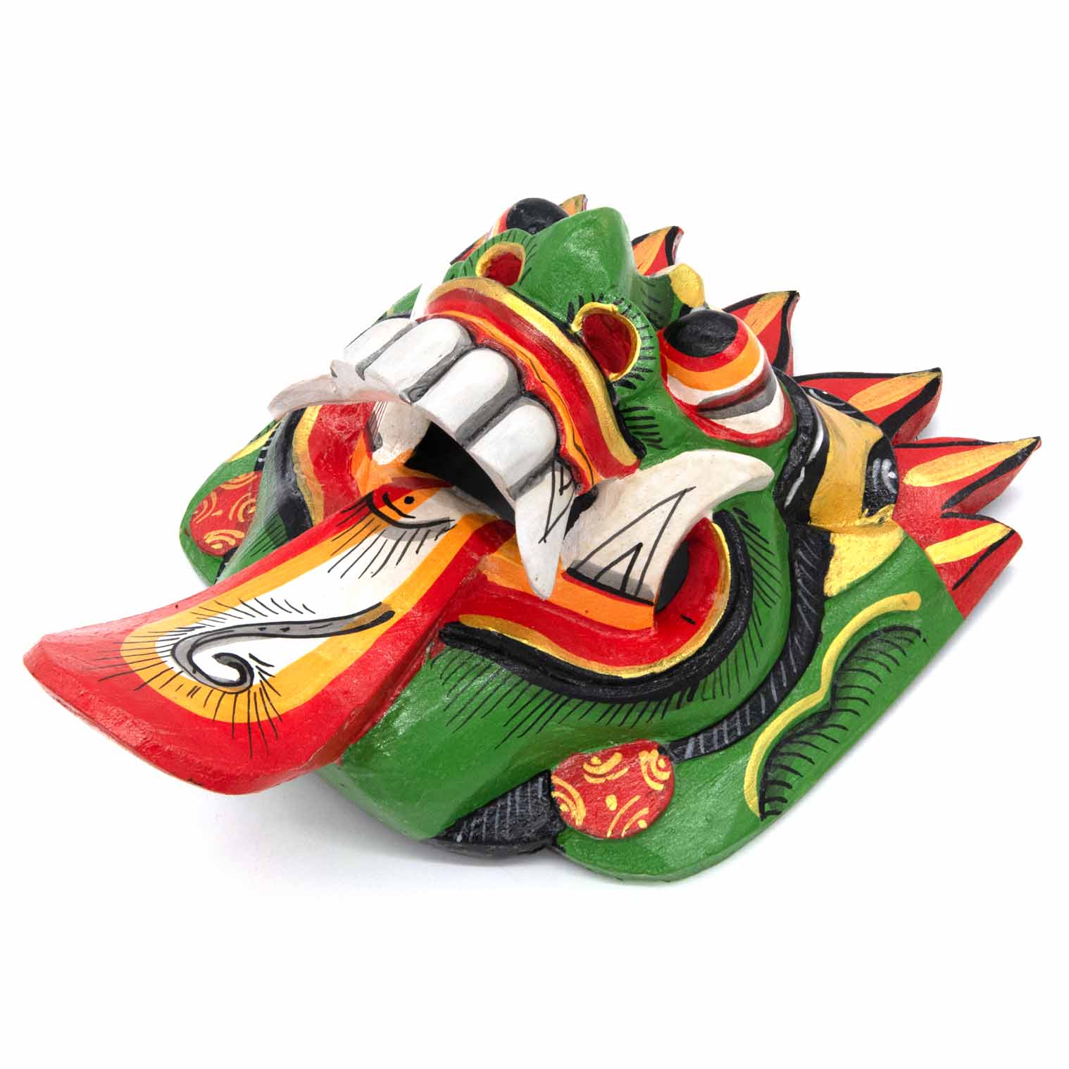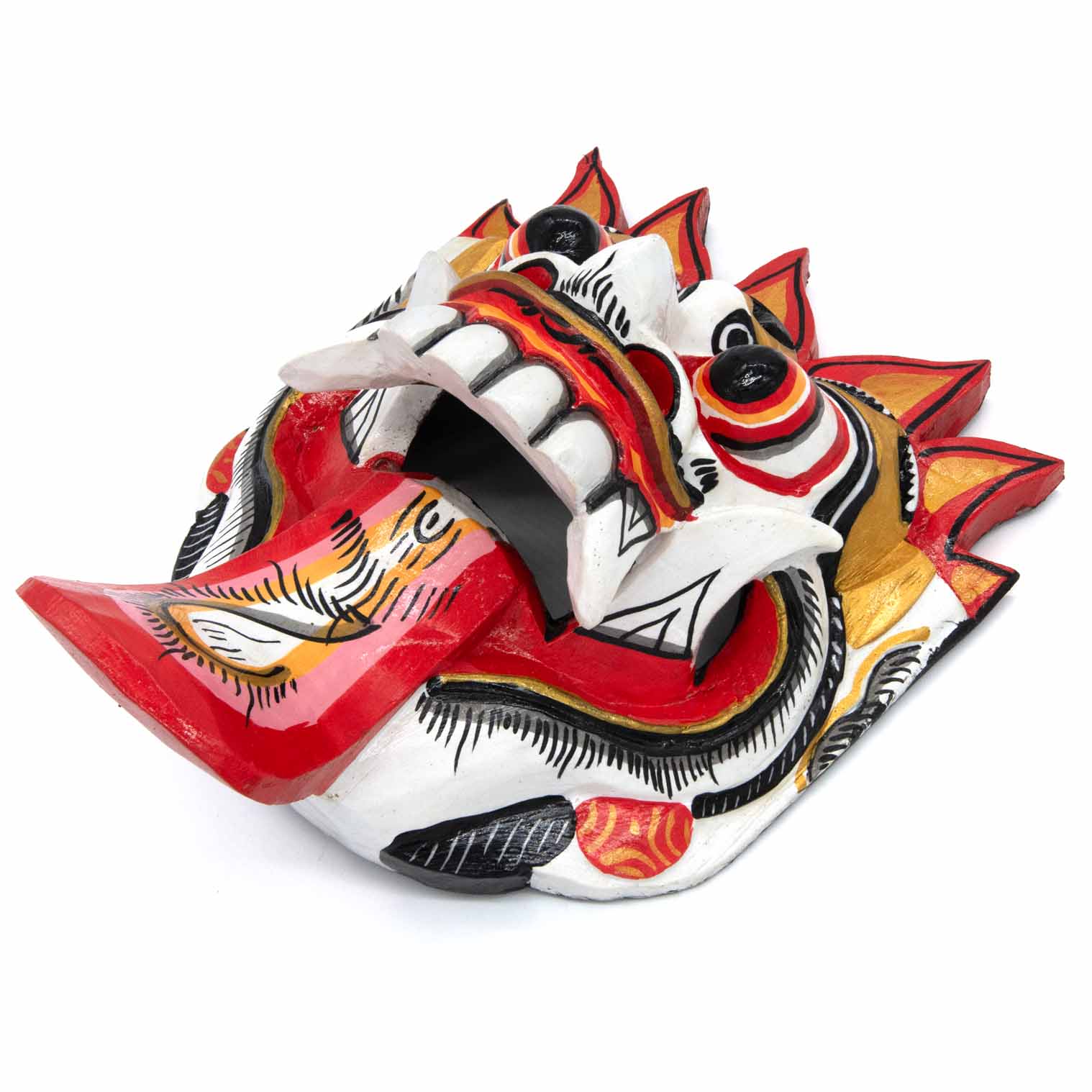 The Rangda mask is a traditional Balinese mask seen in the Barong dance. The mask depicts Rangda who is the queen of witches and represents the personification of all evil. She is depicted with a grotesque visage with protruding fangs, wild goggle eyes and long tongue. In the dance, she leads a terrifying army of witches against the forces of good and their leader, Barong.