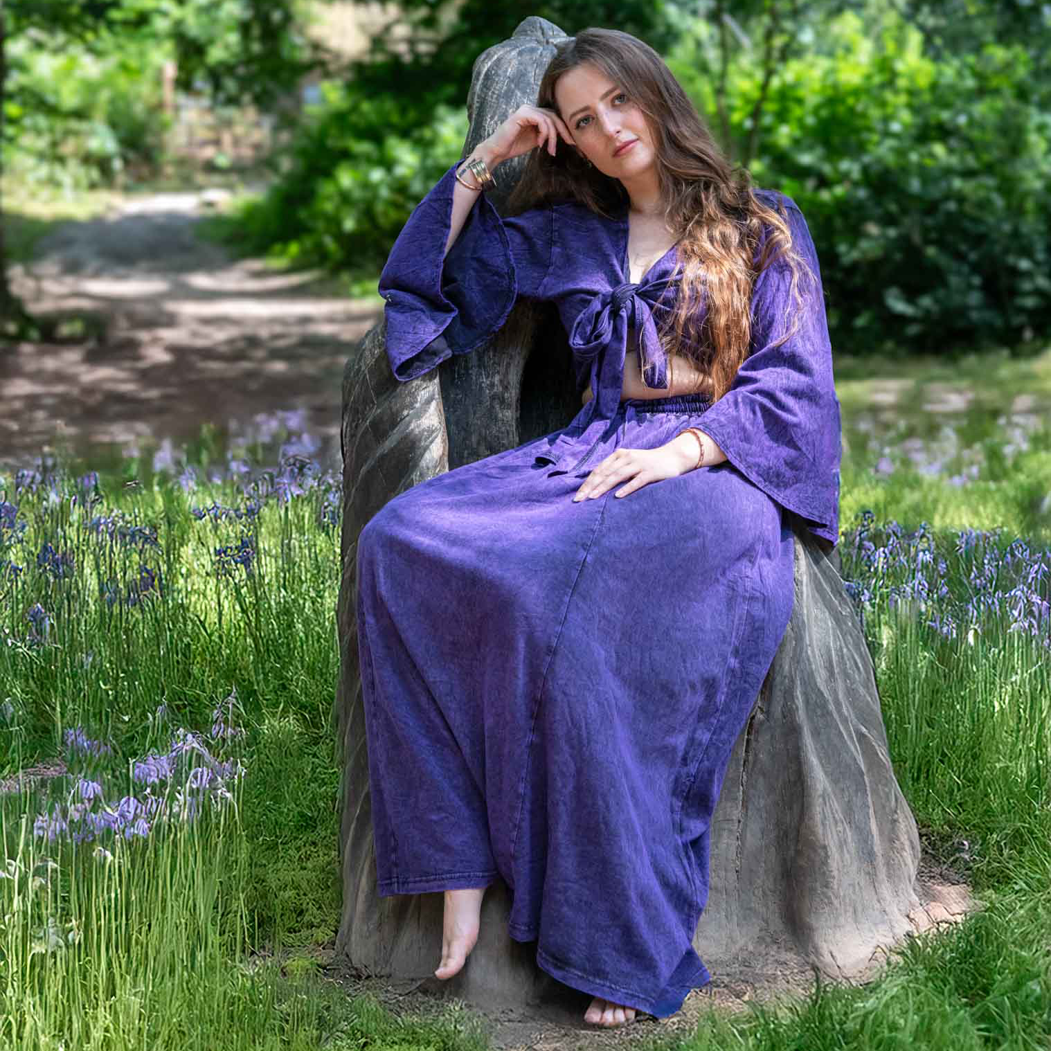 A comfortable and flattering wrap top with a touch of bohemian flair. This soft cotton garment features a crossover front with a deep V-neck and a tie waist that naturally adjusts to your shape. The bell sleeves and stonewashed texture give it a relaxed, lived-in feel perfect for casual wear, festivals, or layering.