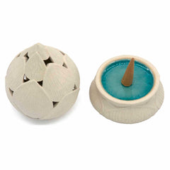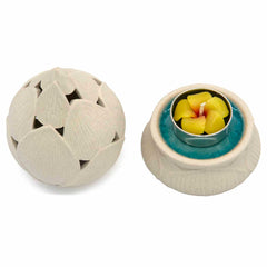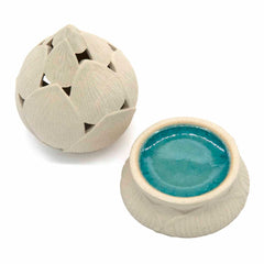 This decorative candle display holds tea lights and small candles. An ambient glow shines through the ceramic leaf design which has been sculpted into an attractive teardrop shape. The base has a pretty aqua blue glazing, whilst the outside has a natural, unglazed look.