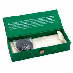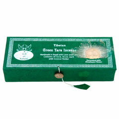 This unique and exclusive handmade incense has a delicate fragrance which is believed to bring good luck, prosperity and to invoke Green Taras swift assistance and protection. It is a blend of juniper berry, green juniper leaves, amber, saldhop, cardamon, nutmeg, cloves, saffron, safflower, gugul, sandalwood, and 108 medicinal and aromatic plants. All of these have been carefully collected from the Himalayas and prepared according to traditional Tibetan techniques.